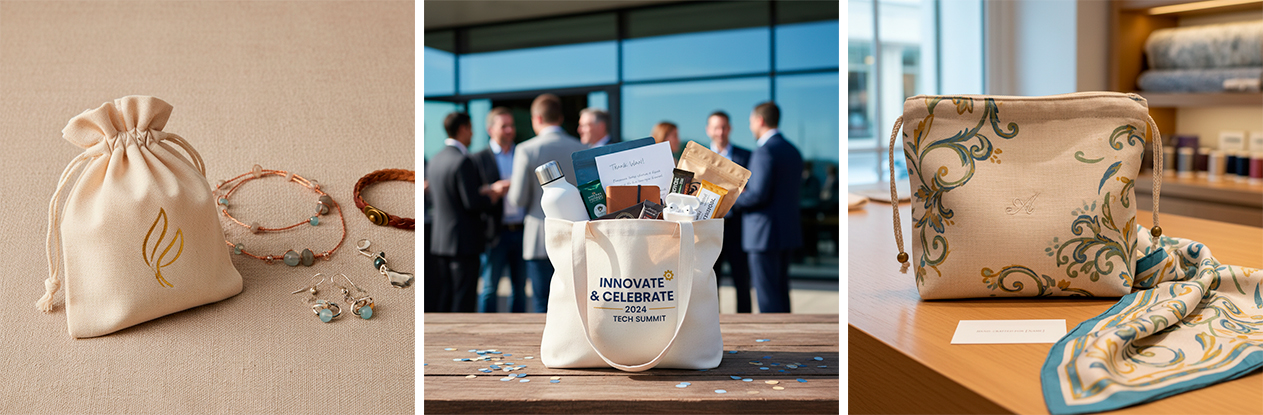 Le tote bag mérite une attention particulière : à la fois cadeau et rangement pratique, il excelle dans les festivals, événements professionnels ou welcome packs. Le pochon, quant à lui, sublime vos cadeaux d'une touche douce et écologique, offrant une seconde vie comme rangement précieux.
