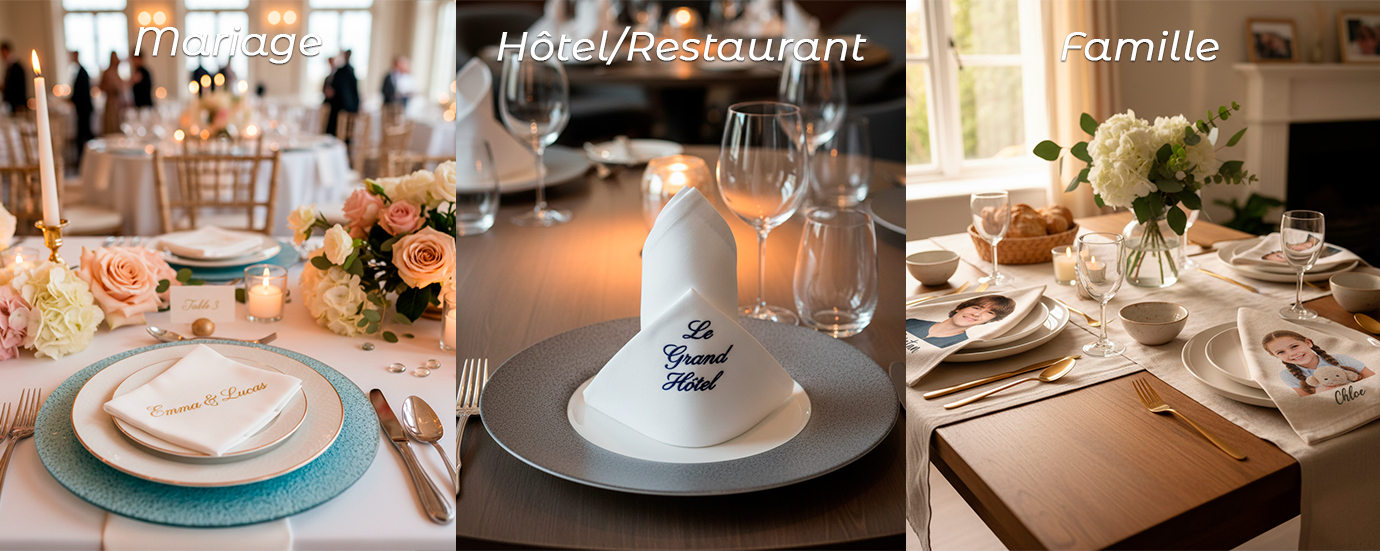 La personnalisation d'une serviette de table offre une grande liberté créative. Plusieurs types de marquages et de formats peuvent être envisagés selon l'usage prévu et l'identité visuelle souhaitée :