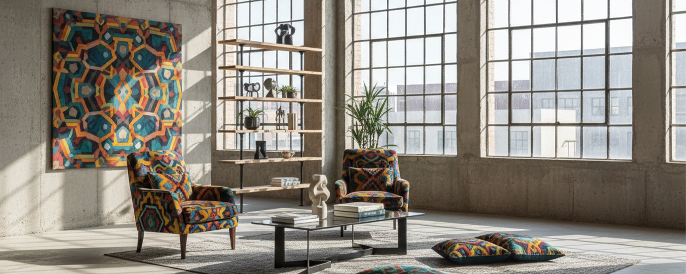Dans un loft urbain, un architecte a joué sur l'opposition entre des murs de béton laissés apparents et des éléments en velours imprimé aux motifs géométriques colorés. Ce contraste de textures et de styles a créé une tension visuelle captivante qui équilibre la froideur industrielle par des touches textiles chaleureuses et sophistiquées.