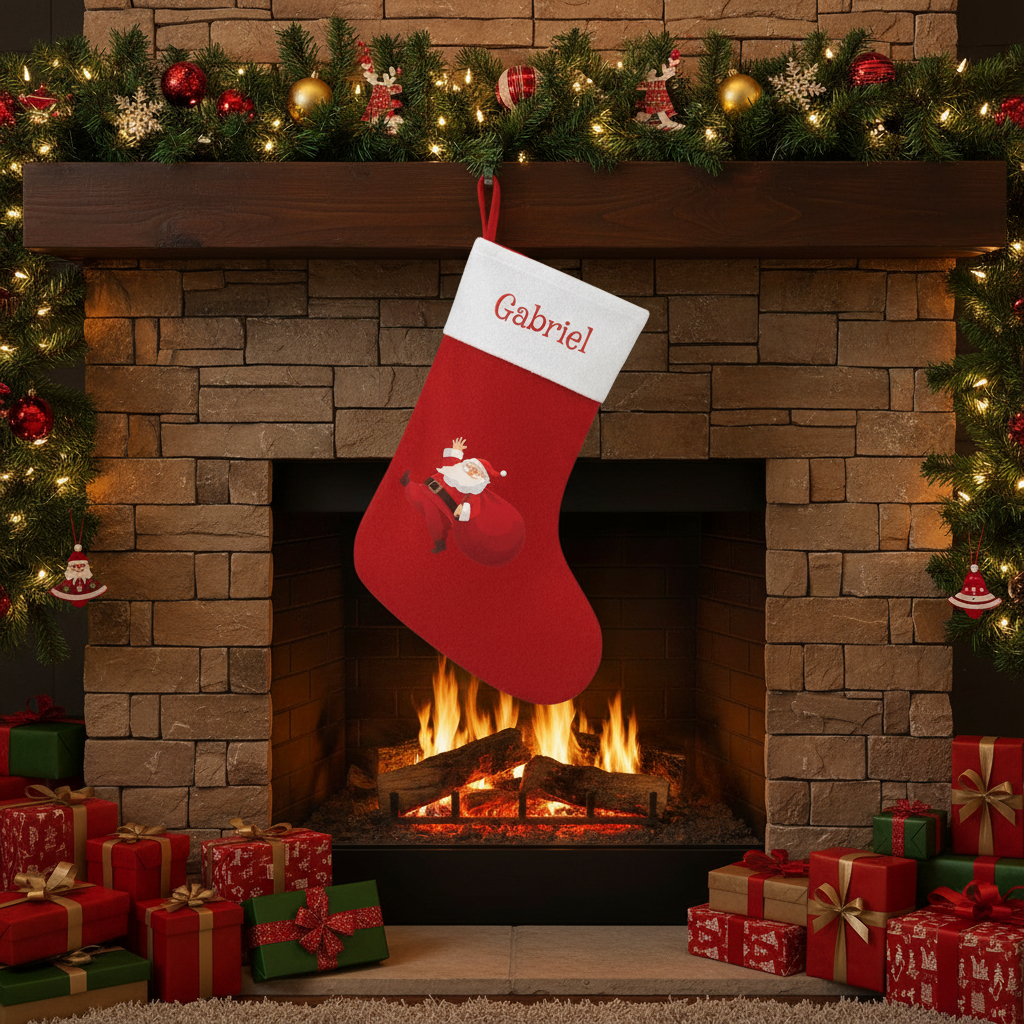 La chaussette de Noel personnalisée est parfaite pour décorer votre cheminée lors des fêtes de fin d'année. Offrez une touche de féérie à votre décoration de Noël avec notre chaussette de Noël personnalisable, marquée avec soin en France par Tissus Print. Personnalisez-la avec un logo, un prénom, une date, un message...