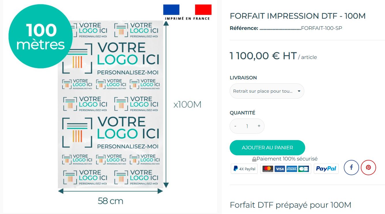 Au-delà des 100 m inclus, vous pouvez soit commander du film DTF au prix au mètre, soit sélectionner une offre forfaitaire plus adaptée.