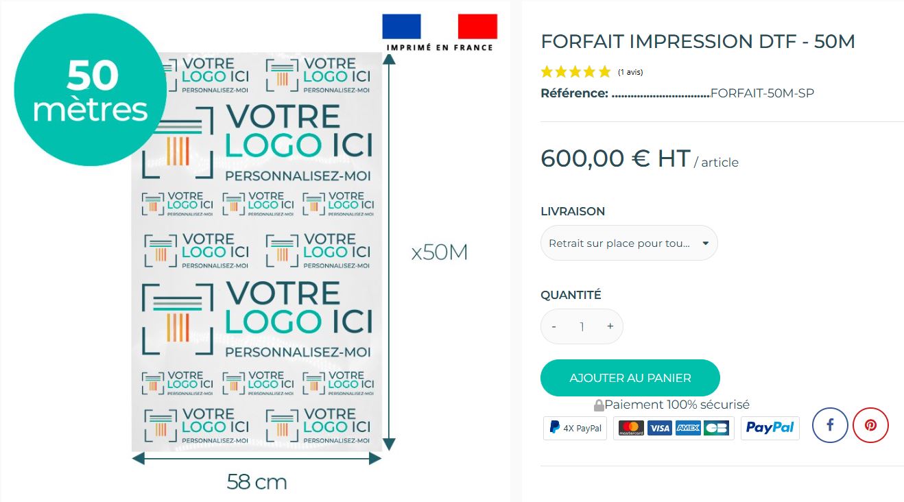 Au-delà des 50 m inclus, vous pouvez soit commander du film DTF au prix au mètre, soit sélectionner une offre forfaitaire plus adaptée.