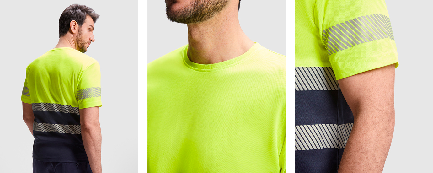 Ses bandes réfléchissantes segmentées sur la poitrine et les manches assurent une visibilité optimale, tandis que son col rond et sa coupe ergonomique garantissent un confort total tout au long de la journée.